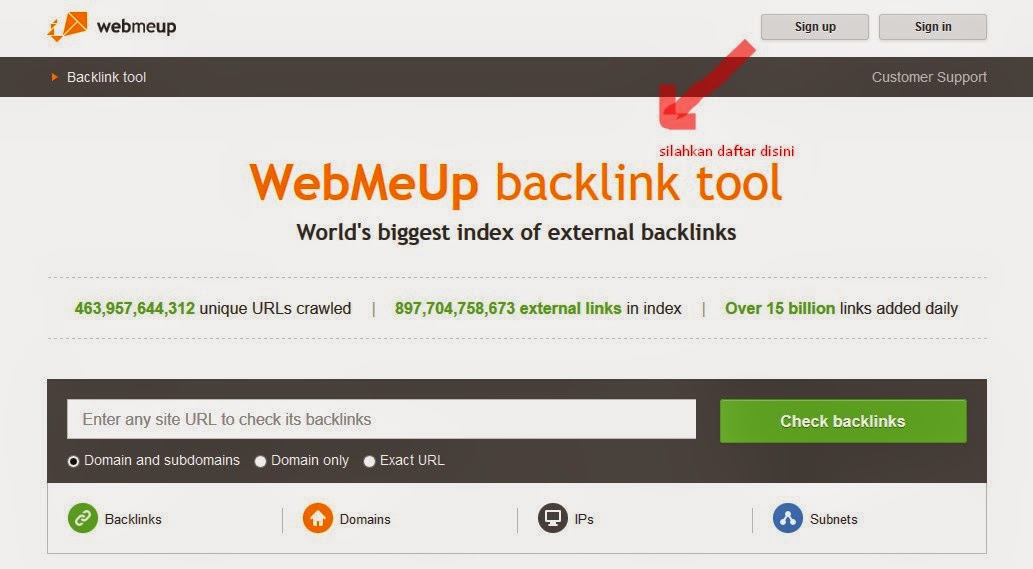 4. Setelah terdaftar, silahkan login : lalu pastekan website kompetitor dikolom : Check Backlinks